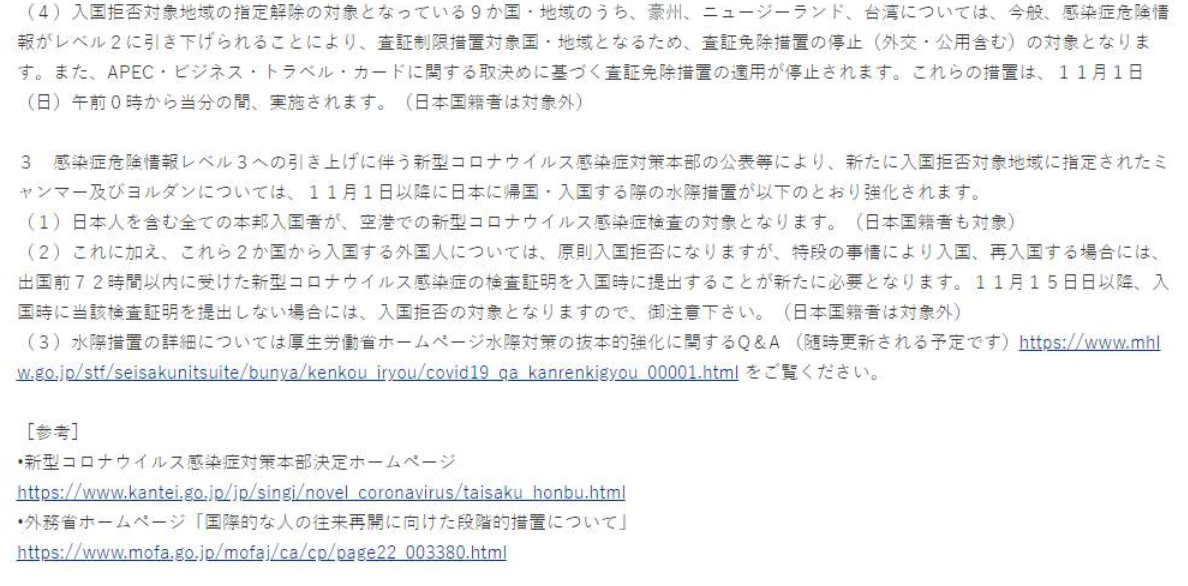 圍繞入境限制,以商務人士等3個月以上中長期逗留的外國人為對象,日本已從10月起有條件允許來自全球各國的入境。有關長期逗留的機制,將維持14天隔離措施,同時恢復往來的“居留通道”。在商務以外,也允許留學生等滯留日本。
