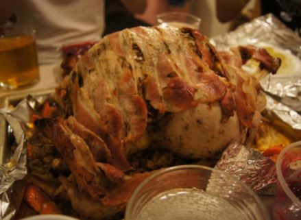 火雞是在西方人的感恩節(jié)餐桌上必不可少的一道菜,此菜起源于1620年,1620年清教徒因不堪承受統(tǒng)治者的迫害和歧視流亡到美洲,當?shù)赜〉诎踩藥椭麄兘⒘俗约旱男录覉@,為感謝在危難之時幫助過他們的印第安人,同時也感謝上帝對他們的“恩賜”,1621年11月第4個星期四,他們將獵獲的火雞制成美味佳肴,盛情款待印第安人;