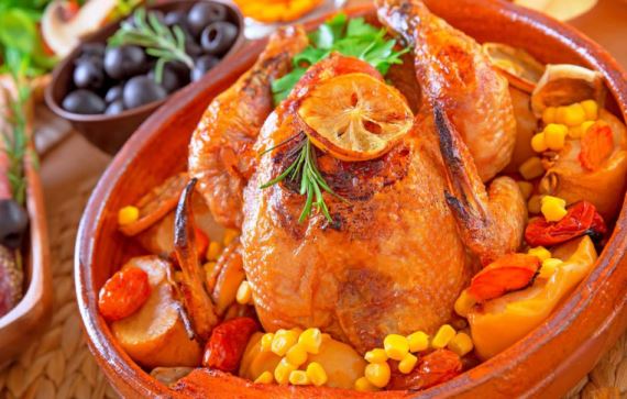 2、一整只雞保留完整,往雞肚子里塞上各種調理和拌好的食品;