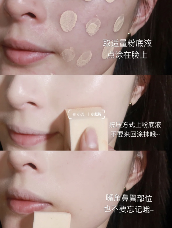化妝師們要么第一種方式是刷子先薄薄的刷一層(如圖,小紅書隨便找的),然后美妝蛋拍勻拍開,如果有需要可以重復再來一遍,不要嫌棄麻煩,如果你們看過韓國女團化妝師的視頻,你們會發(fā)現(xiàn)人家重復了n多次!只要你粉量控制得好,這個方法真的很像磨皮拋光!但是顯而易見就是很浪費時間,建議大型約會之前使用!