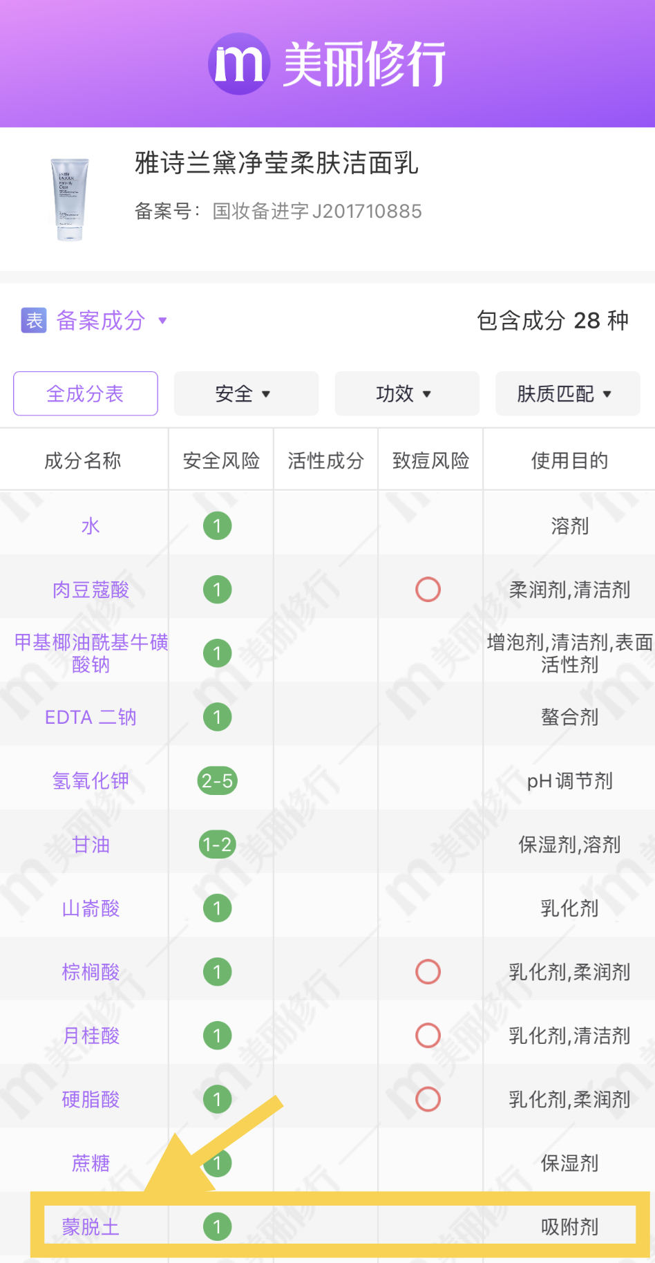 主要成分和他們家洗面奶一樣是蒙脫土,蒙脫土很多人可能不清楚,它是一種火山凝灰?guī)r風(fēng)化后的產(chǎn)物,具很強(qiáng)的吸附力和陽離子交換性,很安全,孕婦也可以用,雅詩蘭黛的凈瑩柔膚潔面乳使用的也是這種成分。