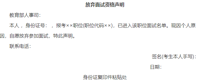 放棄面試要填寫《放棄公務員面試的聲明》,經(jīng)本人署名,在規(guī)定時間前提交;格式如下: