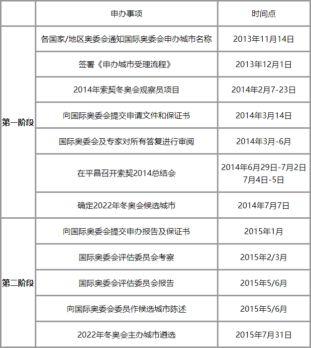 2013年6月6日,國(guó)際奧委會(huì)正式宣布啟動(dòng)2022年第24屆冬季奧林匹克運(yùn)動(dòng)會(huì)的申辦程序。整個(gè)申辦程序包括兩個(gè)階段。